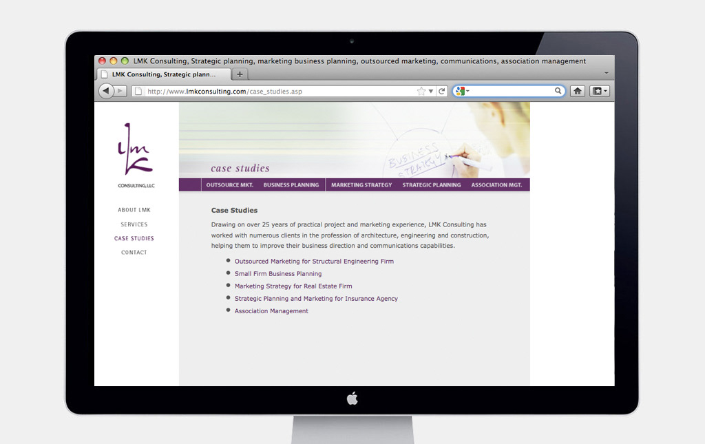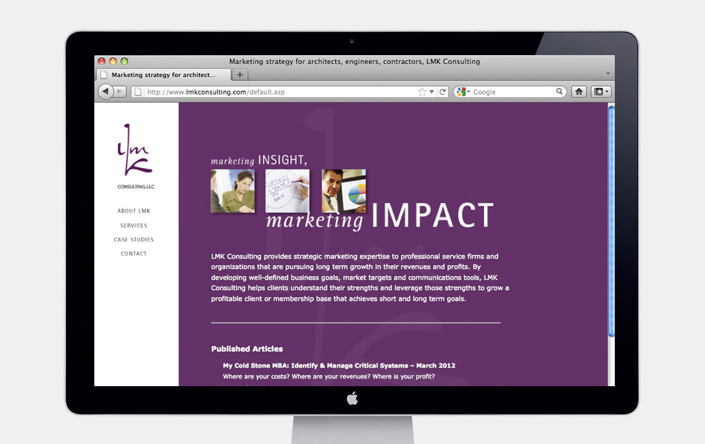 LMK Consulting, Inc. branding project. Materials that I created include: logo, identity materials, stationery, web site design.